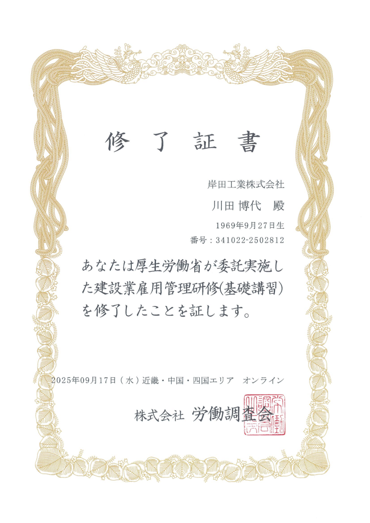 2025年9月17日、朝9時半から午後4時半過ぎまでみっちりzoomで研修会に参加し勉強しました。 岸田工業は良い人材を求めていますので、しっかり今の法令や改定内容などを把握し、社内でも取り入れていく必要があります。 また外国人雇用に関しては今後変わっていく方向性について勉強できました。